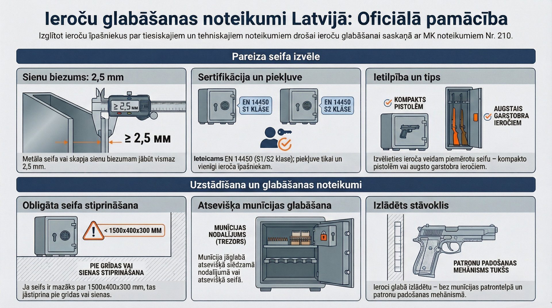 Ieroča iegāde nav tikai tiesību uz pašaizsardzību, medībām vai sportu realizācija, bet arī nopietnu juridisku saistību uzņemšanās. Latvijā noteikumus nosaka valsts, un kļūdas ieroču glabāšanā var maksāt īpašniekam ne tikai licences anulēšanu, bet arī apdraudēt viņa tuvinieku drošību. Daudzi uzskata, ka jebkurš metāla skapis ar slēdzeni ir pietiekams, lai ievērotu likumu. Tomēr būtiskākās nianses slēpjas Ministru kabineta noteikumu Nr. 210 tehniskajās prasībās.